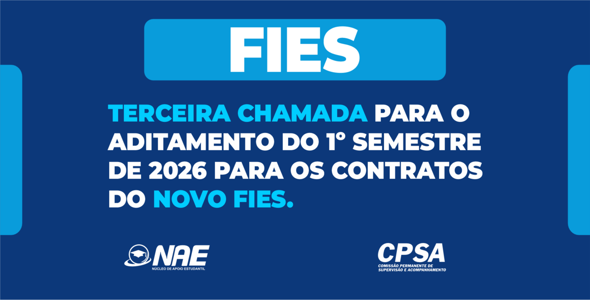 De acordo com a Comissão Permanente de Supervisão e Acompanhamento (CPSA), responsável pelo acompanhamento dos discentes vinculados ao programa, está aberta a terceira chamada para o aditamento do Novo FIES, contemplando alunos de todos os cursos. O novo prazo segue até o dia 31 de março de 2026.