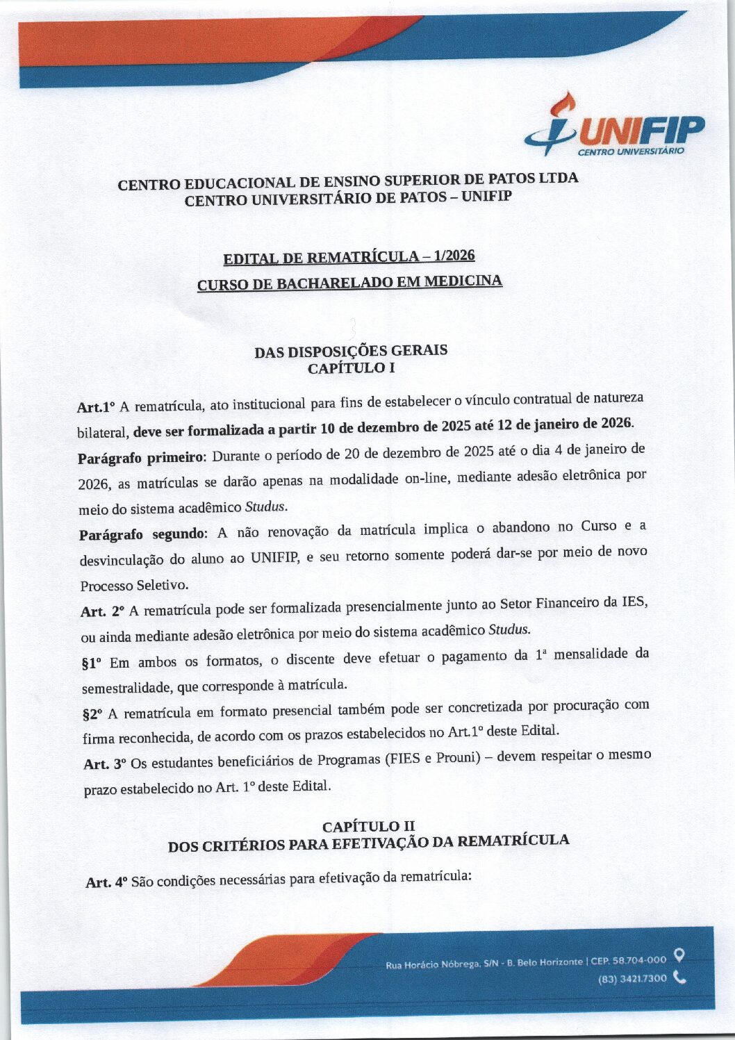 A não renovação da matrícula implicará no abandono do curso e consequente a desvinculação do aluno do Unifip. Nesse caso, o retorno só poderá ocorrer mediante novo Processo Seletivo.