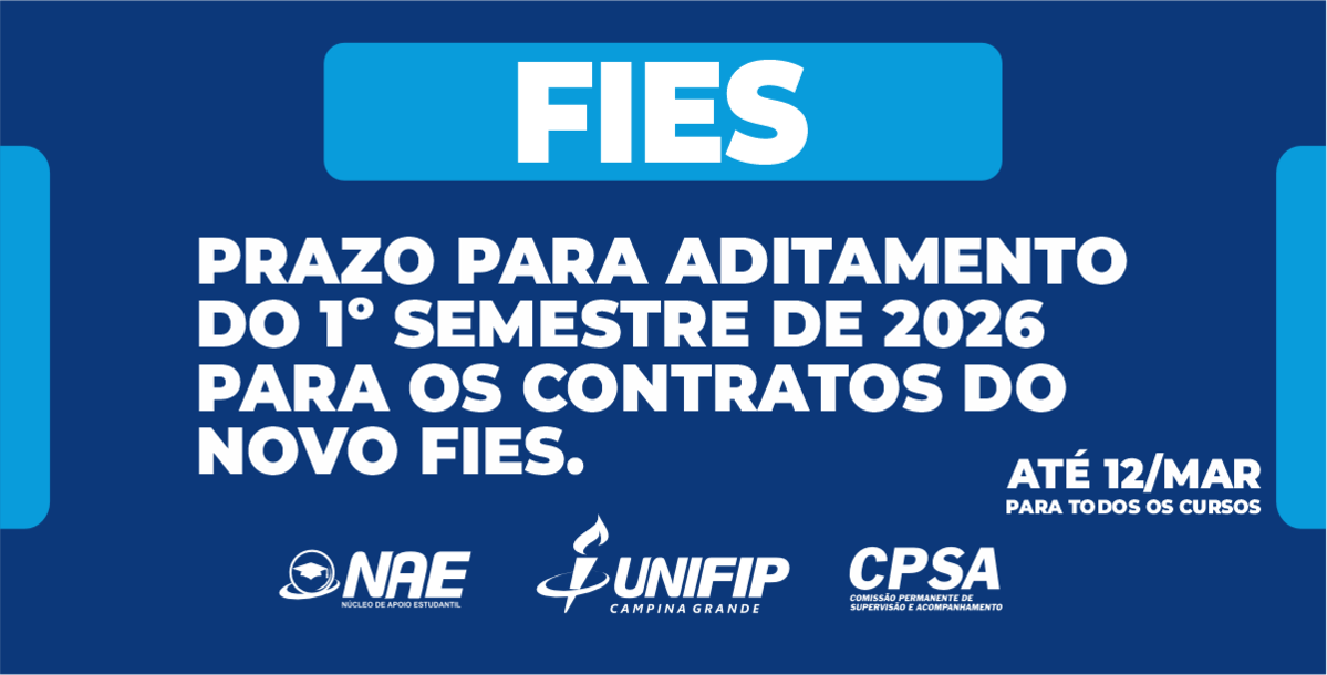 A Comissão Permanente de Supervisão e Acompanhamento (CPSA) da Unifip divulgou a segunda chamada para o aditamento do Novo FIES referente ao 1º semestre de 2026. O prazo foi prorrogado até o dia 12 de março de 2026, contemplando os contratos de todos os cursos da instituição.